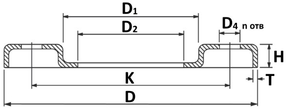 | DN/Наружный диам трубы | D | D1 | D2 | D4 | K | H | n отв. | T | PN |